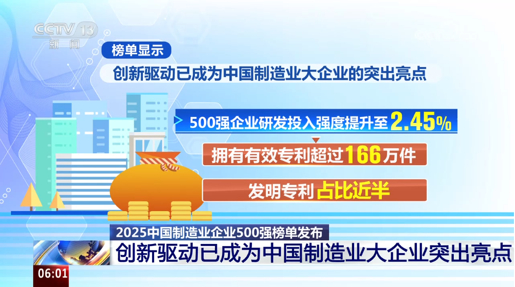 2025中國制造業(yè)企業(yè)500強(qiáng)榜單參照國際通行的做法,以2024年企業(yè)營業(yè)收入為入圍標(biāo)準(zhǔn),入圍門檻持續(xù)提升,從“十三五”末的110.91億元提高至173.65億元,標(biāo)志著我國制造業(yè)大企業(yè)整體實力穩(wěn)步增強(qiáng)。2025中國大企業(yè)創(chuàng)新100強(qiáng)則聚焦企業(yè)研發(fā)投入強(qiáng)度、研發(fā)費用、發(fā)明專利數(shù)、收入利潤率等指標(biāo)的綜合評價,挖掘和展現(xiàn)中國大企業(yè)的創(chuàng)新能力與成果,現(xiàn)已成為衡量企業(yè)創(chuàng)新水平的重要指標(biāo)之一,本次為連續(xù)第5年推出。
