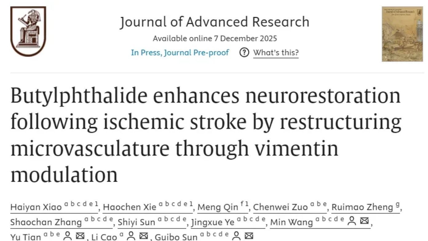 近日,中國醫學科學院北京協和醫學院藥用植物研究所孫桂波教授團隊研究成果《Butylphthalide Enhances Neurorestoration following Ischemic Stroke by Restructuring Microvasculature through?Vimentin Modulation》發表在《Journal of Advanced Research》雜志(影響因子13.0分),首次明確丁苯酞(NBP)通過靶向Vimentin(VIM)重塑微血管網絡,進而促進缺血性腦卒中后的神經修復,為NBP的臨床用藥提供了堅實的理論基礎。