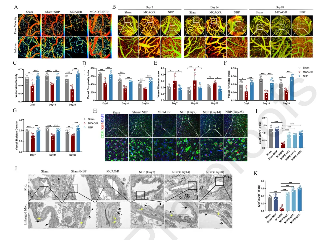 結果一:建立大鼠腦卒中模型給予NBP治療,結果顯示NBP促進卒中后腦血流和新生血管形成。