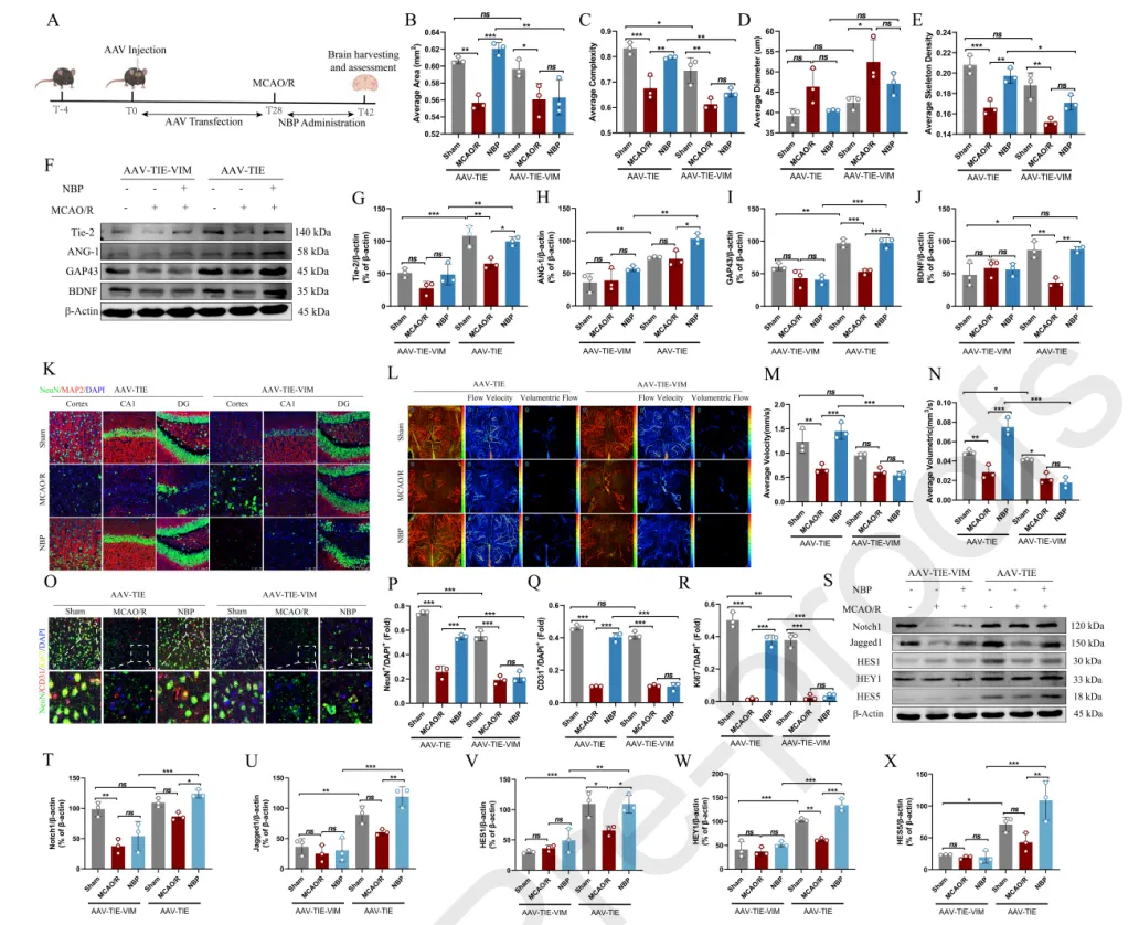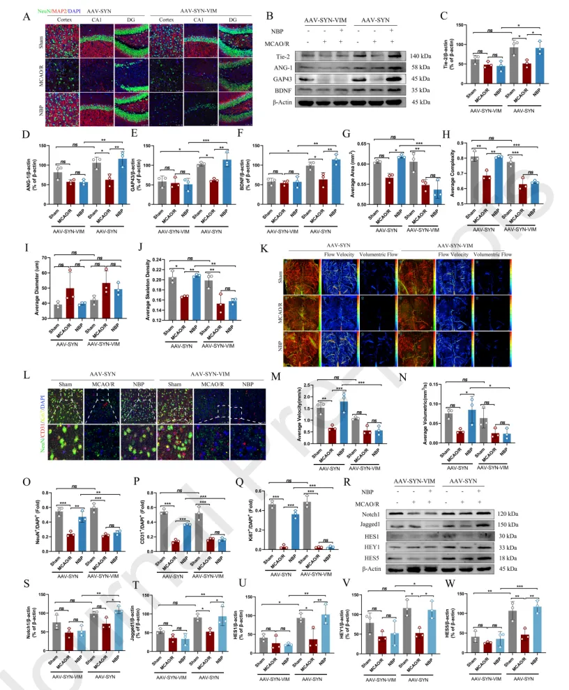 結果五:構建了特異性敲低神經元中的VIM的小鼠模型,研究發現特異性敲低神經元中的VIM未顯著影響新生血管形成,但對神經修復產生影響。研究顯示NBP通過靶向VIM,進而激活了在血管新生和神經發生中都起關鍵作用的Notch信號通路,從而協調促進卒中后的微血管重建與神經修復。