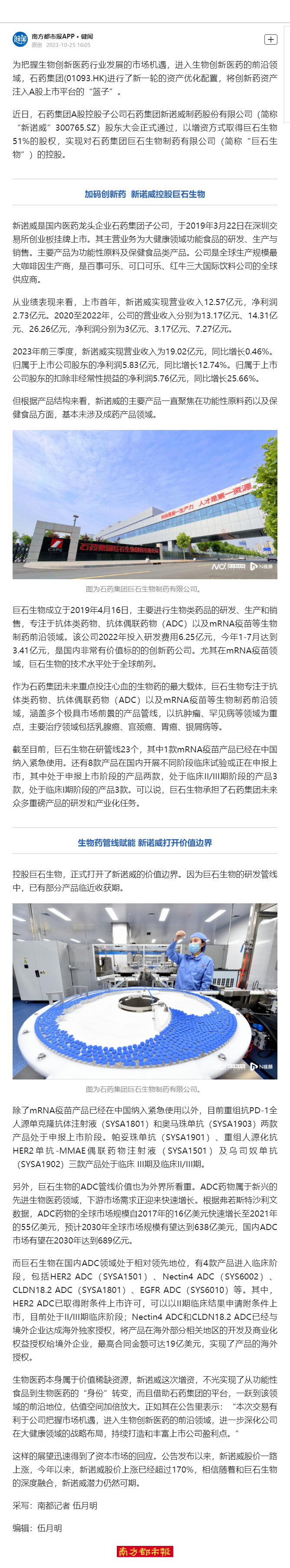 近日,石藥集團A股控股子公司石藥集團新諾威制藥股份有限公司(簡稱“新諾威”300765.SZ)股東大會正式通過,以增資方式取得巨石生物51%的股權,實現對石藥集團巨石生物制藥有限公司(簡稱“巨石生物”)的控股。