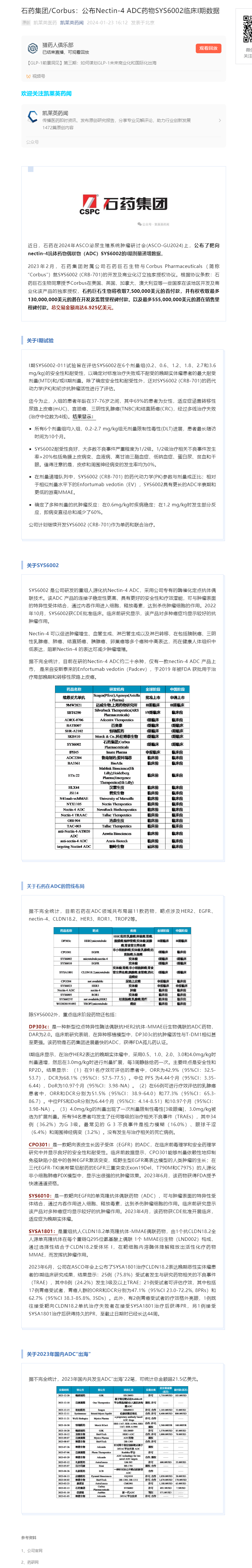 石藥集團/Corbus:公布Nectin-4 ADC藥物SYS6002臨床I期數據