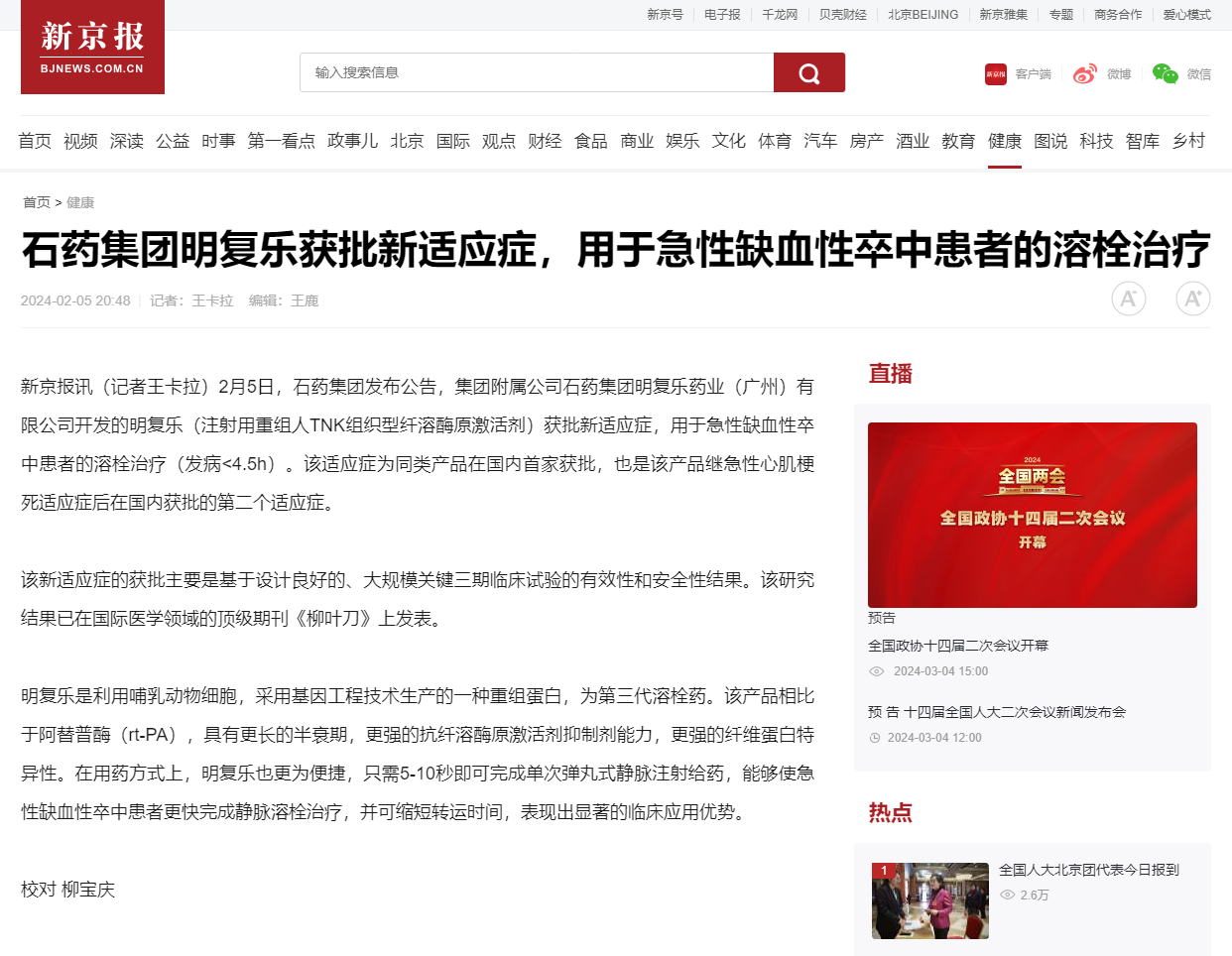 石藥集團明復樂獲批新適應癥,用于急性缺血性卒中患者的溶栓治療