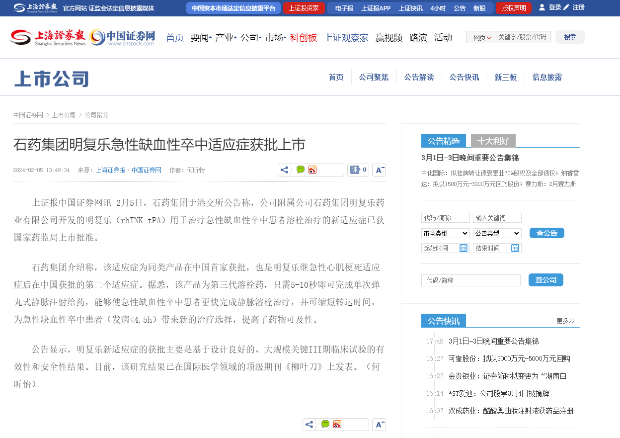 石藥集團明復樂急性缺血性卒中適應癥獲批上市