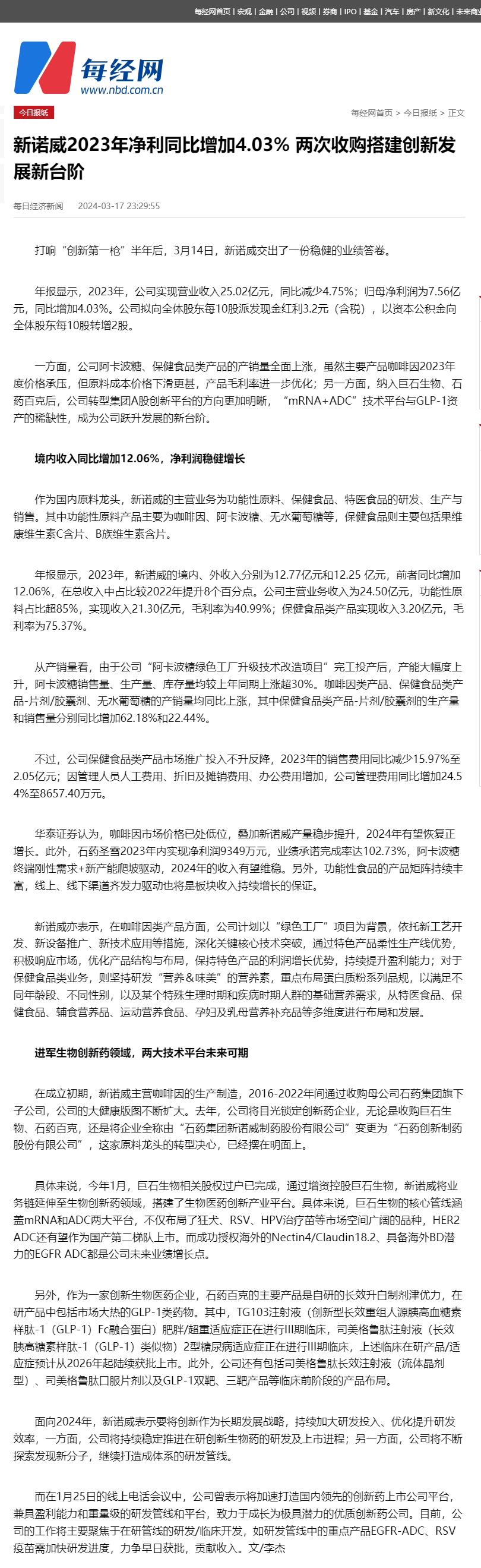 新諾威2023年凈利同比增加4.03% 兩次收購搭建創(chuàng)新發(fā)展新臺階
